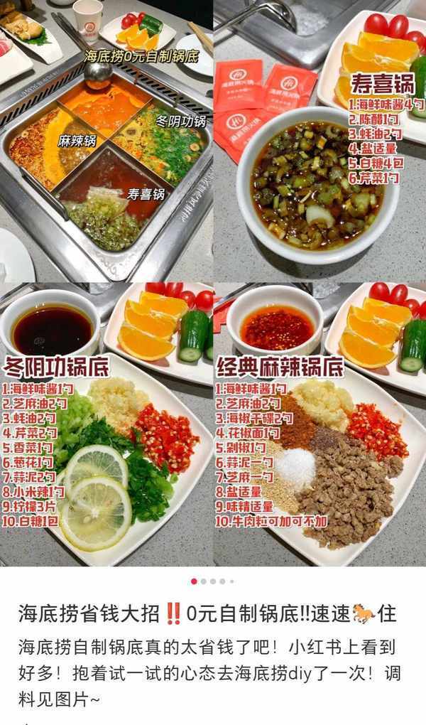 不过,抱着吃垮海底捞信念的羊毛党则一个锅底都不点,全部用小料台上的原料自制。比如麻辣锅:海鲜味酱1勺、芝麻油2勺、海椒干碟2勺、花椒面1勺、剁椒1勺、蒜泥1勺、芝麻1勺、盐味精适量。除此之外,还有藤椒锅底、大酱牛肉锅底、冬阴功锅底、寿喜锅锅底等各类0元自制锅底攻略。
