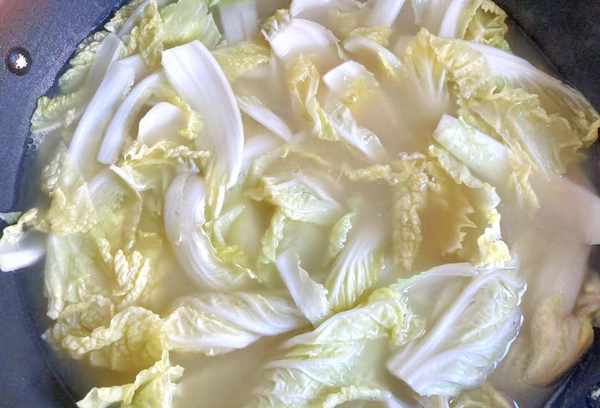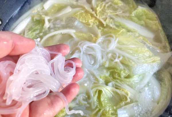 第六步:将娃娃菜放入锅中,中火煮3分钟,最后加入准备好的魔芋粉丝继续煮2分钟,将魔芋粉丝煮熟。