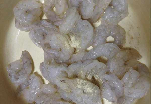 第三步:将活虾挤去头,用牙签挑起虾线,剥去虾壳放入碗中,加入一勺料酒,加盐和适量生粉腌制。虾均匀入味。