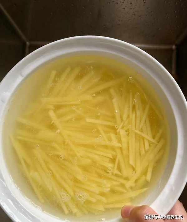 第二步:用工具将土豆去皮,洗净切成薄片,将土豆泥放入容器中,加入适量的水,将土豆泥用清水浸泡,洗净里面的淀粉,捞出检查水分。