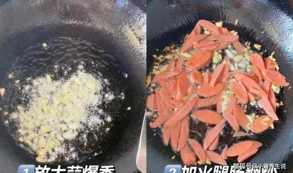 第四步:锅底放少许食用油,加入蒜末爆香,加入火腿肠翻炒,大火翻炒均匀。