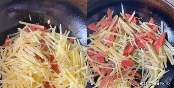 第七步:快速翻炒片刻,起锅,香辣火腿肠和土豆片就做好了。磨碎的土豆非常脆,酸酸可口,味道太浓了,不适合米饭。