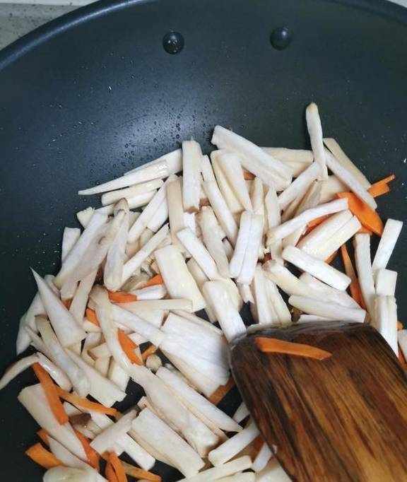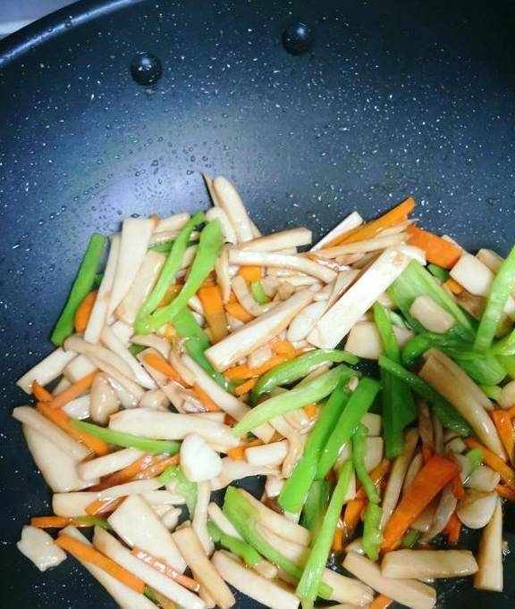 3.转小火把杏鲍菇炒软,整个过程不用放水。