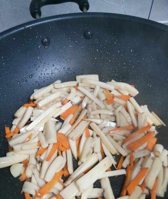 2.起锅上火倒入适量油,油热后放入蒜粒爆香,然后下入胡萝卜翻炒20秒,再放入杏鲍菇翻炒至有水分出来。