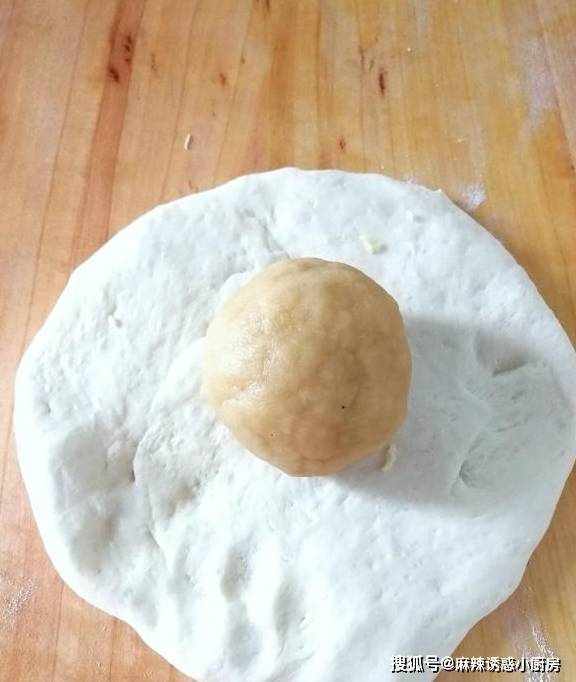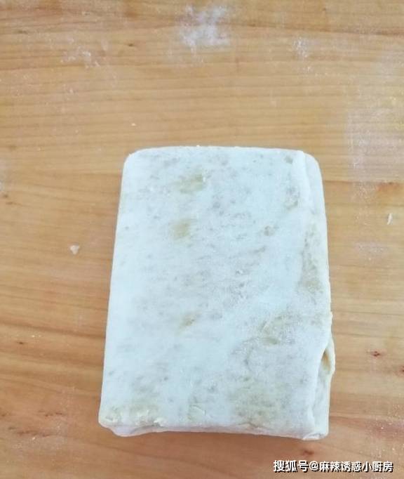 第三步:面团发酵以后,拿出来揉一揉,用发酵好的面,包上油酥面,口封好,压扁擀开。折叠起来,再擀开。如此重复三次。