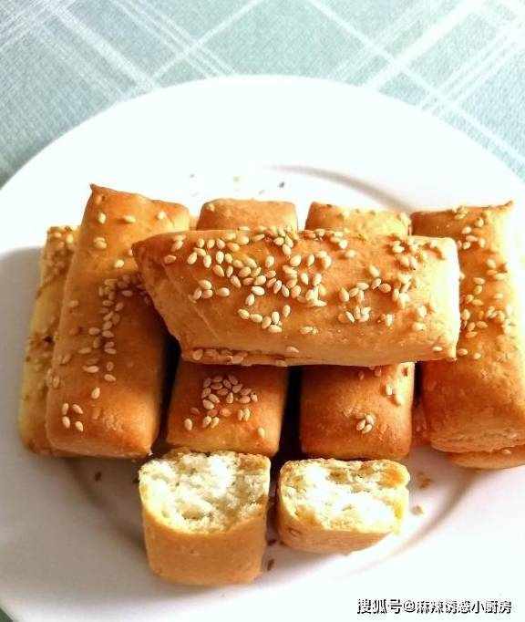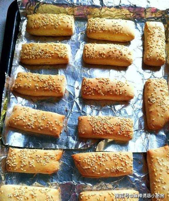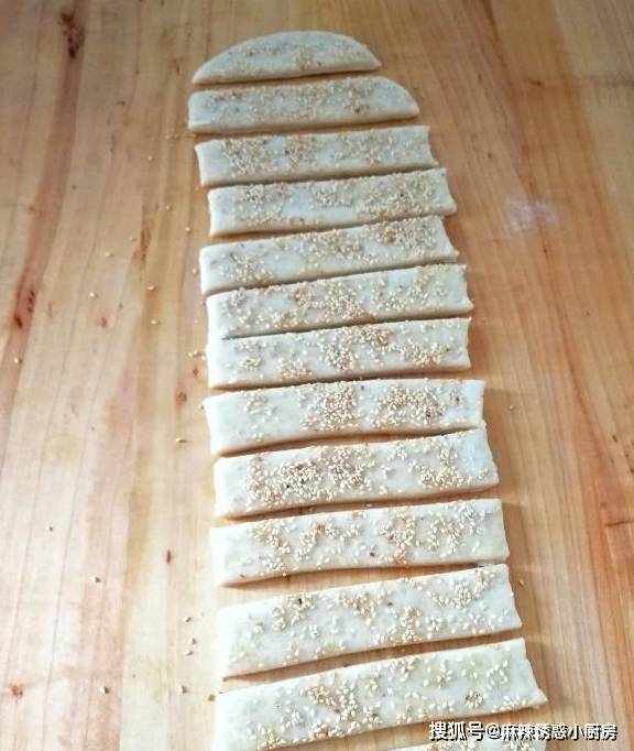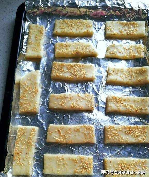 第五步:切成小条状,也可以切成正方形,或者自己喜欢的形状,撒上适量白芝麻,烤出来吃着脆脆的,有浓浓的芝麻香味。也可以撒自己喜欢的其他干果仁。