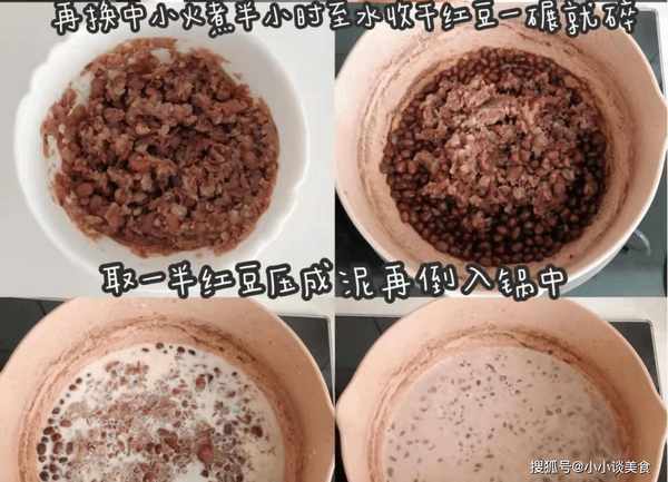 第三步:红豆取出放入碗中,用勺子捣成红豆沙,然后放入汤锅中,加少许水,加少许纯牛奶,盖上锅盖继续烹饪。