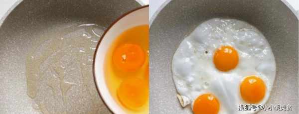 第一步:准备一些备用材料,锅底加入少许食用油,打几个鸡蛋,待鸡蛋稍微剥皮,翻面煎至熟,切块。