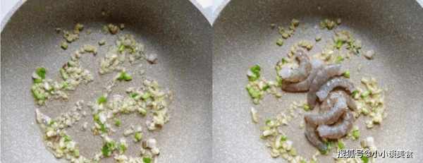 第四步:接着锅底倒入少许油,加入葱花和姜末快速炒出香味。加入虾,快速煎,让虾煎至变红。