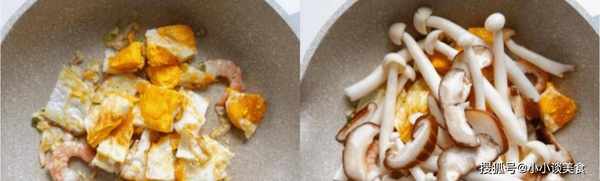 第五步:倒入煎好的鸡蛋,翻炒几下,加入白玉菇和香菇片,加适量开水,没过所有材料,盖上锅盖煮8分钟。