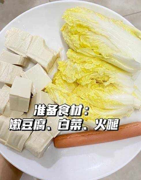 材料选择:选择150克左右的新鲜娃娃菜(或者选择生菜或者卷心菜,娃娃菜热量很低而且味道很甜很肥,很受减肥朋友的欢迎),一块高买质量好的火腿香肠(或用猪肉或牛肉代替),买一大份软豆腐(约300克,豆腐是大豆做的,优质蛋白质和钙质,软豆腐烧可以用来炒菜,营养吸收好,平时可以给孩子),两大碗冷水,半勺白胡椒粉,少许植物油或猪油,少许葱蒜,几滴香油,少许盐等调料。