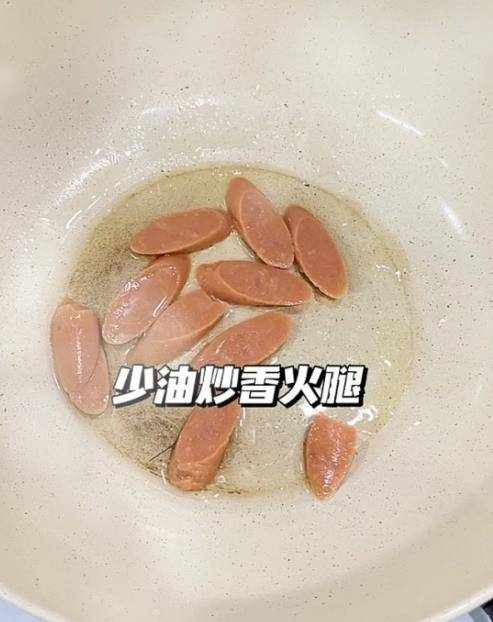 3:锅底稍微烧热,加入少许猪油和植物油,油的温度要热了,放入火腿肠块,快速翻炒几下,火腿肠等炸好。微微泛红。
