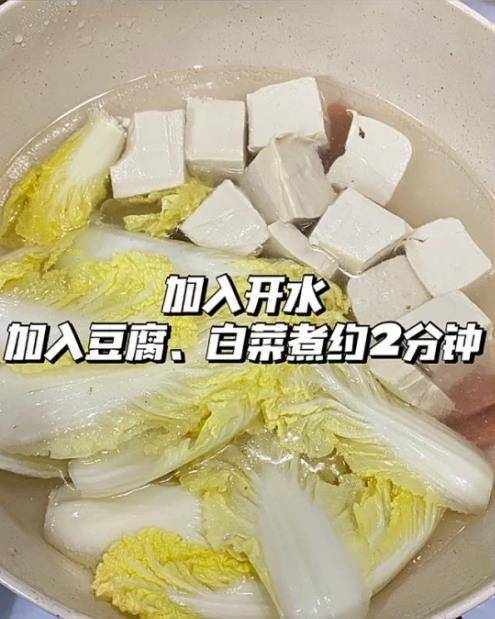 4:加入几大碗水烧开,加入一些软豆腐块和娃娃菜,继续煮两分钟,煮到娃娃菜变软。