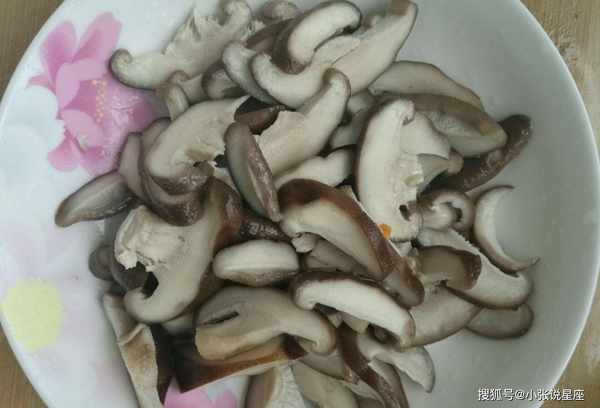 第四:锅内放适量水,加小苏打一勺半,盐一勺,放入新鲜香菇焯一下,捞出香菇切块。