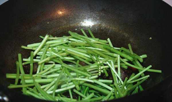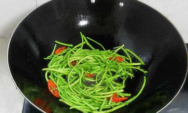 第五步:另起一锅,锅底加少许花生油,放入姜蒜,再放入青蒿,翻炒至青蒿碎。