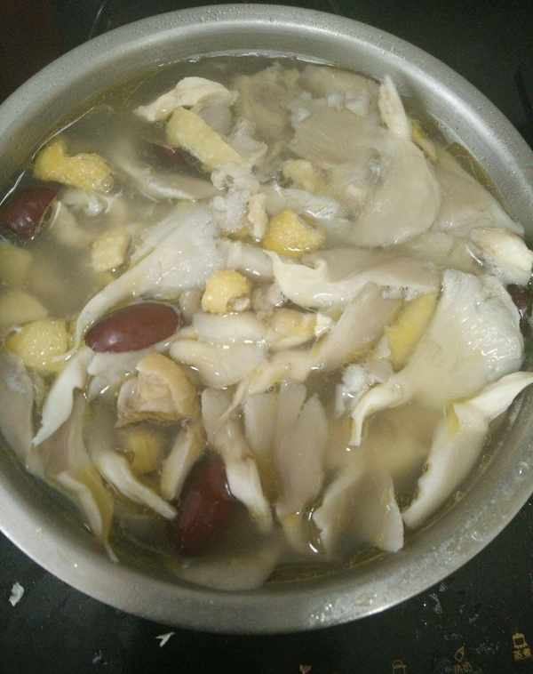 第七步:鸡肉烧开后,转小火慢慢煮,撇去表面的油(因为很多人觉得太肥),加点凤尾菇。
