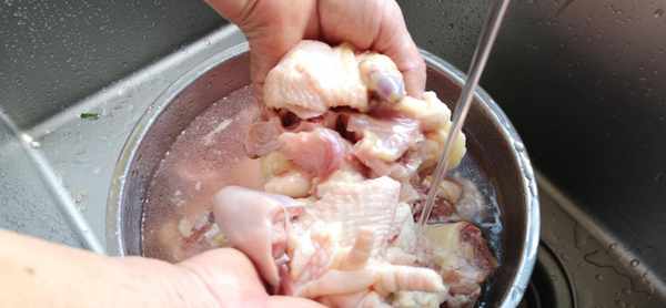 第二步:将老狗块用清水漂洗几遍,将狗块放入盆中,加入适量冷水,将血水浸泡在冷水中,反复清洗,检查水分。