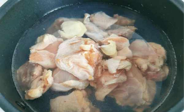 第三步:炖锅中放入鸡块,加入足够的冷水,加入适量姜片,一小段葱,少许花椒,加少许料酒,将鸡块放入热水中煮熟,凉水洗