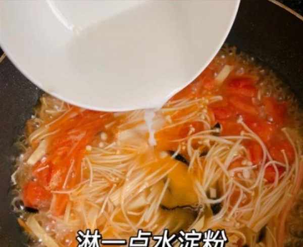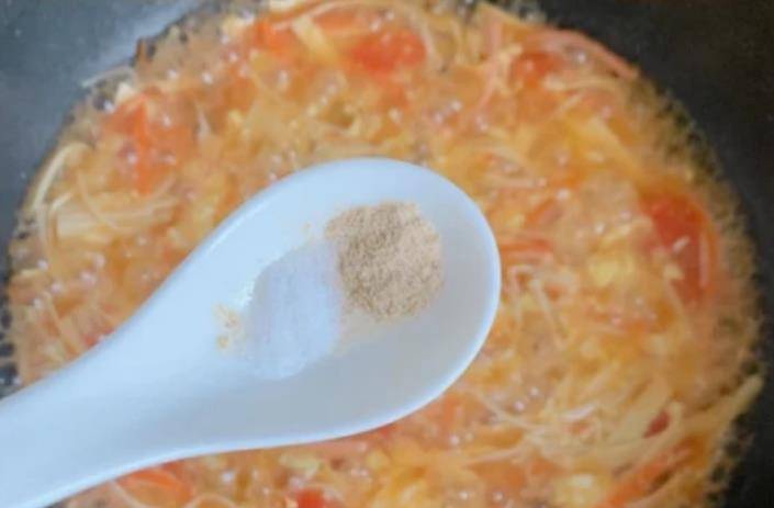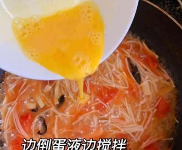 第八步:倒入适量水,淀粉勾芡,加入准备好的蛋液,稍微搅拌一下,等蛋液慢慢凝固,加入半勺极鲜,撒上盐和胡椒粉继续煮。一阵子。