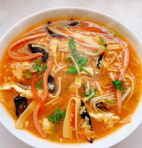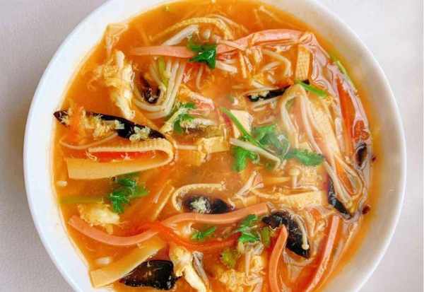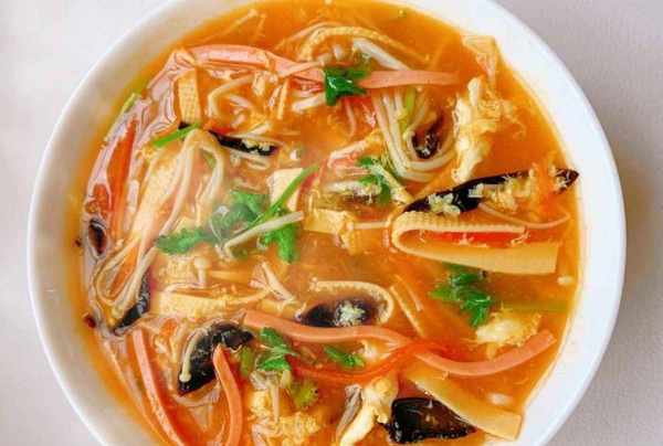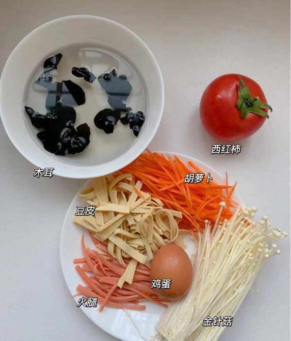 配料明细:选择优质火腿肠一根,自制鸡蛋两个,新鲜西红柿一个,胡萝卜半根,豆皮约80克,金针菇60克左右(金针菇是一种很好吃的白蘑菇,可以用金针菇来煮汤,让汤翻倍),黑蘑菇40克左右,水几大碗,温水少许,水淀粉少许,小葱少许,香油几滴,菜油少许,盐一匙,胡椒粉一小匙,生抽一匙,香醋两匙,香菜两枝,蚝油半匙等小食。