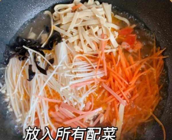 第七步:将胡萝卜丝、金针菇、黑蘑菇、火腿肠和豆腐丝依次放入锅中,盖上锅盖,用高火煮片刻。