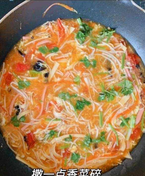 第九步:加入香油,放入香葱或香菜,稍炒片刻后起锅。这道西红柿、豆类、火腿和鸡蛋的汤就做好了。汤汁酸甜可口,营养丰富。每个人都喜欢喝酒。
