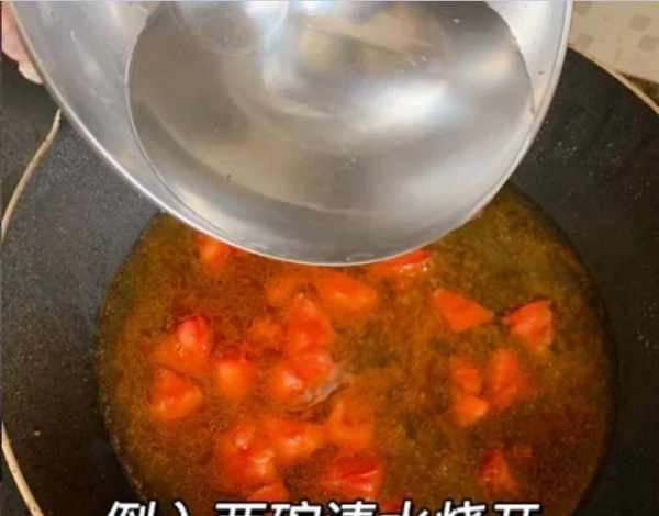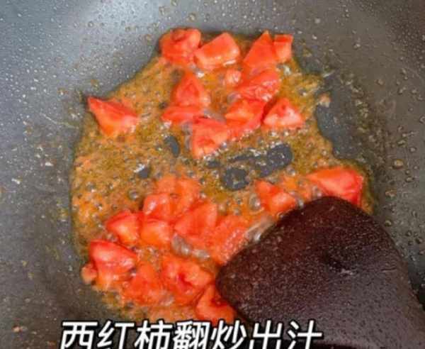 第六步:锅底放少许食用油,放入切好的西红柿,大火翻炒出汁,西红柿炒成沙状,加两大碗水,盖上锅盖,大火煮温度。热。