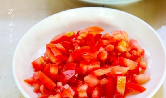 2、洗干净的番茄把它切成片,再改刀切成末,装入一个干净的盘子中备用,番茄切的小一点比较容易炒出红沙。