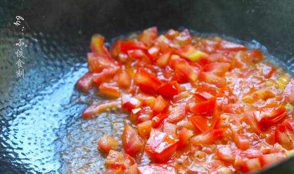 4、锅中放入植物油,烧至5成热的时候,放入蒜末,把切好的番茄倒进去开始炒,炒出红沙,放入盐和番茄酱。