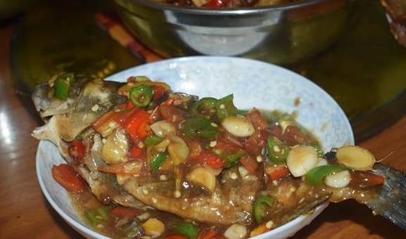 葱烧鲤鱼,老家后院有个小池塘,公婆一起在里面养了很多鲤鱼,这条鱼是老公一大早下去捕上来的,以前每次回来都是婆婆下厨,这次也只能自己硬着头皮上了,鲤鱼处理干净后,用油煎至表面金黄,出锅后淋上用大蒜和彩椒做的酱汁,鱼肉嫩滑可口,就是鱼刺有点多。
