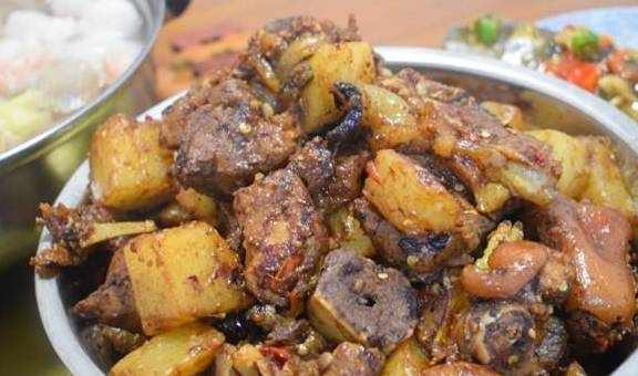 土豆炖猪蹄,这个猪蹄是我当天回来之后去镇上买的,这些猪都是附近村民自己养的,不管是味道还是营养都比城里菜场的要好很多,而猪蹄中富含胶原蛋白和钙质,非常适合公公婆婆这种上了年纪的人食用,由于老家还是那种老式烧柴的锅,因此火候掌握比较难道,炖出来的猪蹄表面有点焦黑,卖相不怎么好,但是猪蹄软烂可口,用嘴轻轻一吸就脱骨了。