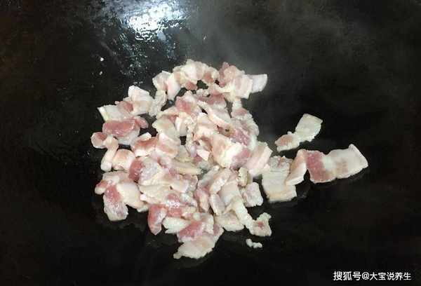 第四步:锅底倒入少许食用油,放入切好的五花肉翻炒片刻,沥干五花肉的油脂,一直翻炒。