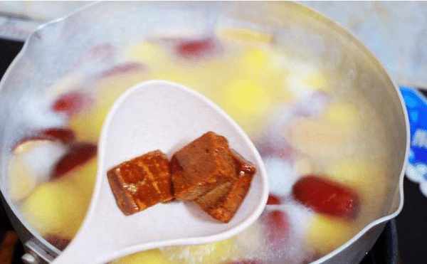 5:取一锅烧开一锅水,放入红枣数颗,加入红糖一块,煮约12分钟,将红枣食入汤中。