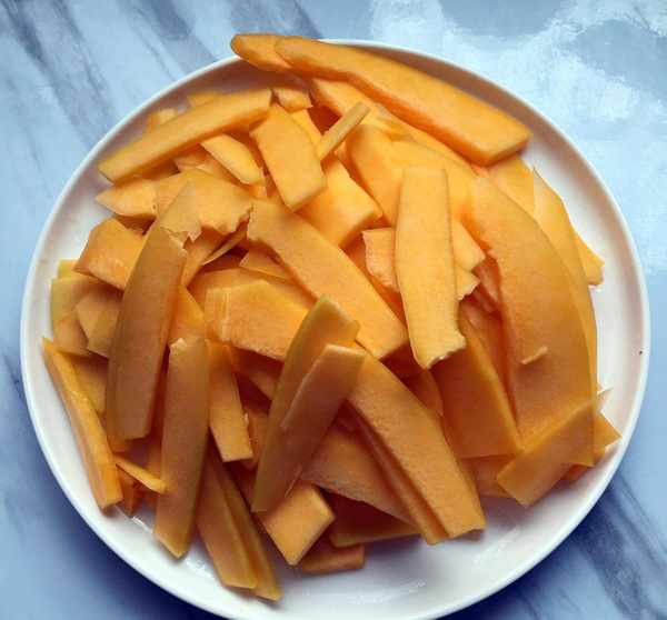 1:栗子南瓜切去头尾,南瓜去皮,去南瓜肉,南瓜洗净切成几块待用。