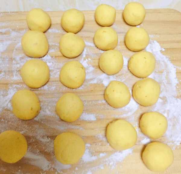 4:然后揉成无气孔的面团,揉成黄色,揉成长条,揉成小剂子,再揉成小丸子放在案板上待用,这样那个南瓜汤圆粘在一起了。