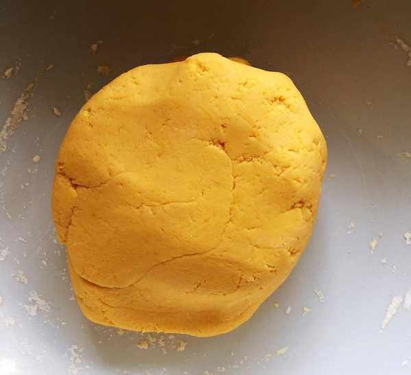 3:把蒸熟的南瓜放到一个大一点的容器里,把南瓜全部磨碎,按同样比例倒入糯米粉,加入适量热水,不要加太多,用筷子把南瓜糯米粉拌匀就可以了。用手反复揉成一个球。