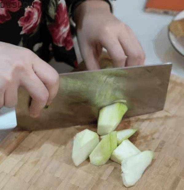 第二步:将丝瓜去掉多余的部分,洗净切成热板片,将丝瓜片用清水浸泡,防止丝瓜氧化变黑,捞出丝瓜,控干水分。