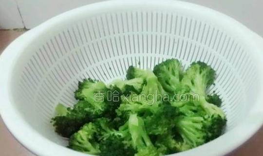 5.焯过水的西兰花倒到洗菜篮里面沥干水份。