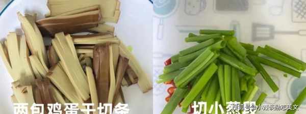 第一步:先将干鸡蛋用清水洗净,将干鸡蛋切成长条,锅中烧开两小碗水,水开后加入干鸡蛋,用大火浸泡,再用冷水泡一下,水是干的,所以鸡蛋干的味道很淡。