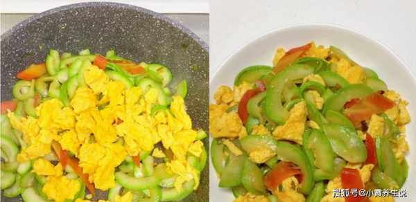 第七步:等到西葫芦煮软后,倒入一些鸡蛋块,搅拌约30秒,然后从锅中取出。胡萝卜西葫芦炒蛋的制作就完成了。