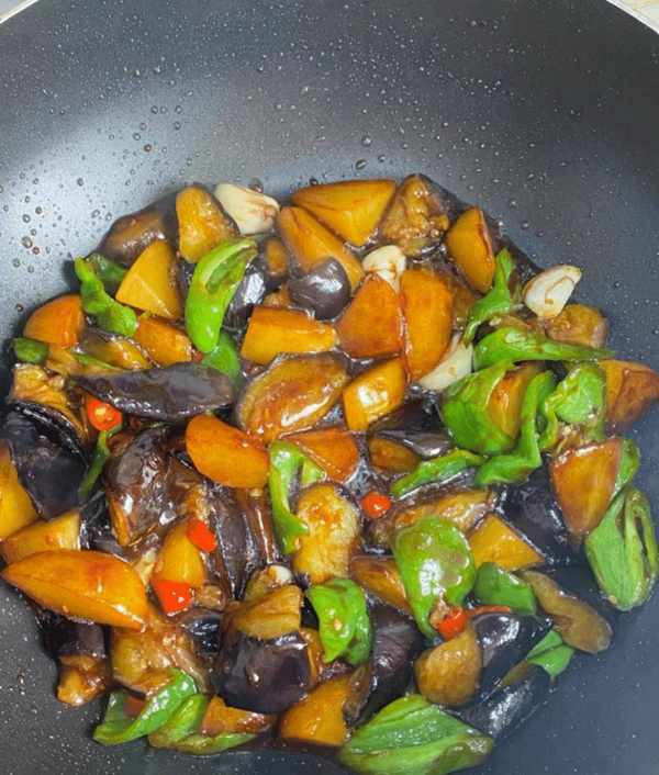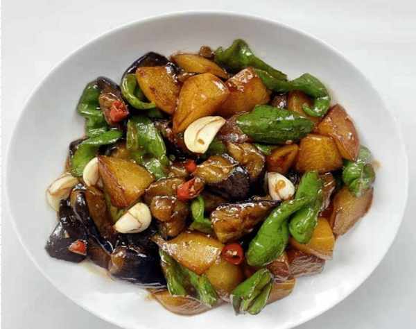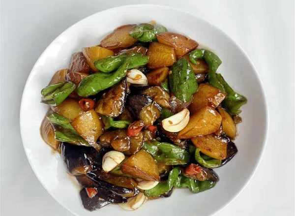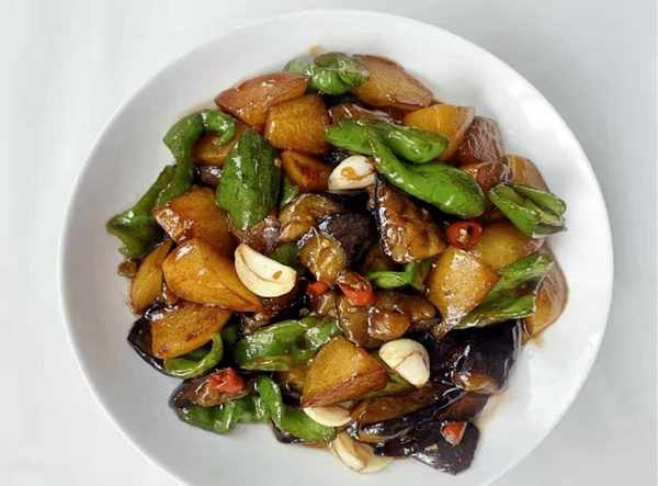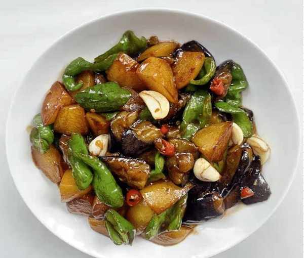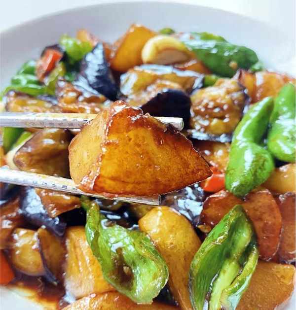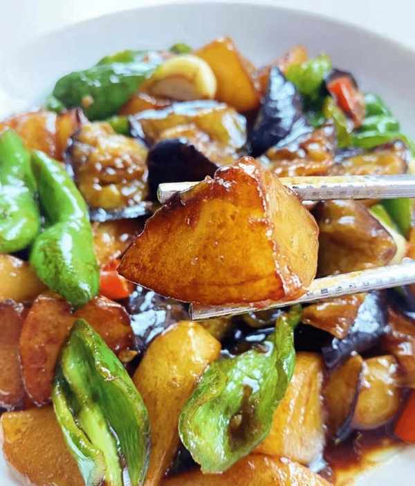 青椒土豆烤茄子是饭店里必备的家常菜。茄子柔韧细嫩,土豆有粉红色的味道。这道菜是用酱汁包裹的。