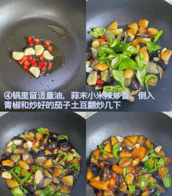 材料说明:准备350克新鲜茄子(市场上茄子品种很多,选择细长、有弧度的紫色茄子,这样的茄子比较嫩,不含激素,茄子的皮应该特别光滑,比较脆,捏嫩,嫩茄子是这道菜的标配,老茄子味道不好,营养价值大部分流失),买土豆200克左右(两个左右,土豆皮纹路清晰,光滑无凸起,不发芽不腐烂),准备大蒜5瓣,辣小米一对,鲜青椒两个,食用油少许,淀粉适量,生抽两勺,老抽一勺,一匙蚝油,一小碗水,一滴糖等等。