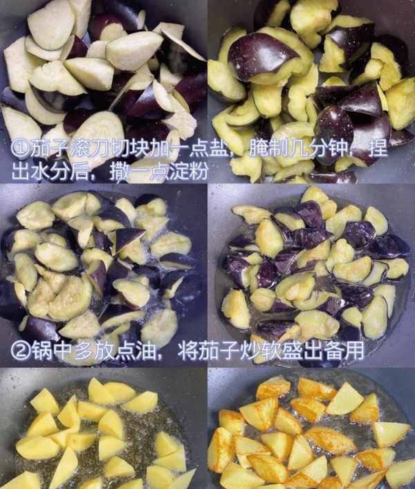 1:准备好青椒、茄子和土豆备用。将紫茄子的两端去皮。将茄子洗净,切成盘子。将茄子块放入容器中,加一勺盐,用盐腌一会,可以破坏茄子系统的组织,挤出脏水,挤出水分,裹上少许淀粉变硬。在旁边。