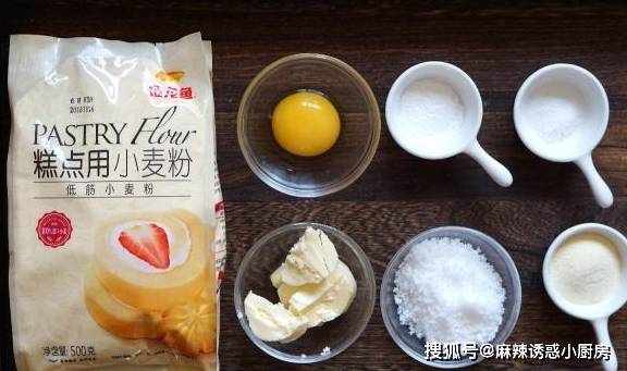 【食材】金龙鱼糕点用小麦粉100克,黄油50克,奶粉10克,蛋黄1个,盐一克,白糖35克,泡发粉1克。