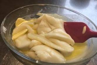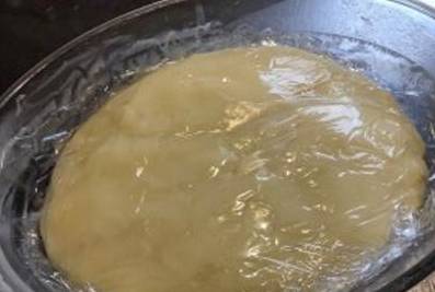 再将过滤好的面糊装进一个玻璃容器里面,盖上盖子,起锅烧水,大火蒸30~40分钟至面糊熟。面糊一出锅就往里面加入无盐黄油,然后用勺子搅拌至黄油融化。