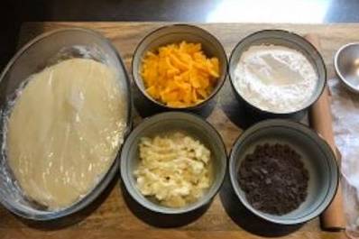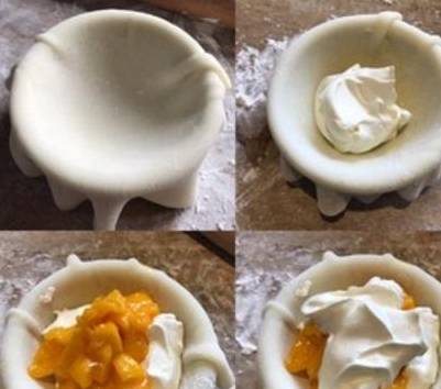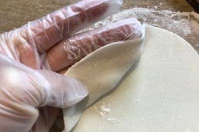 带上一次性手套,案板上撒上少许的糯米粉,然后揪一块面团搓圆,再用擀面杖擀成厚薄均匀的面皮,再往上面放上淡奶油和水果,再用包包子的手法进行收口,上面撒上少许糯米粉,防止粘连,倒扣进纸杯里面,这样我们的雪媚娘就制作好了。