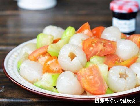 5.海绵和番茄炒软后,加入荔枝肉,翻炒几下即可上桌。