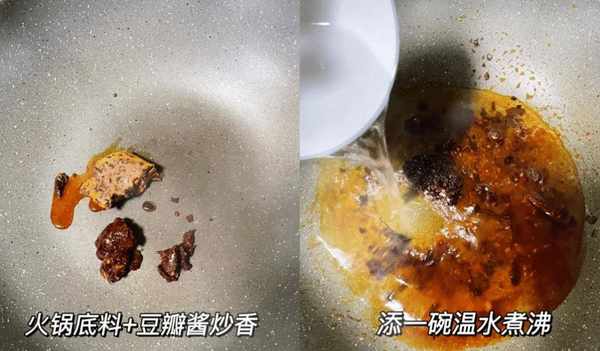 第三步:锅底加少许食用油,热的材料下锅底,下豆瓣酱炒红油,下姜末和蒜末,下小米炒香,加入适量温水煮沸。
