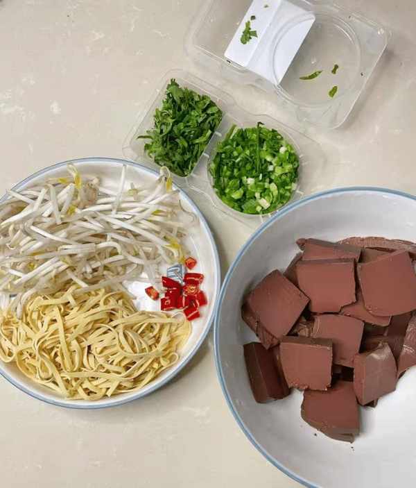 准备食材:买一盒鸭血(250克左右,也可以选择羊血或者猪血),买黄豆芽120克左右,豆腐100克左右(豆腐是一种常见的豆制品,两者都可以炒着吃也适合做小菜),选小葱3粒,香菜2条,大葱或干辣椒少许,热锅底一小块,豆瓣酱一匙,温水适量,蟹黄皮几张,食用油少许,姜蒜少许,椒盐等调料少许。