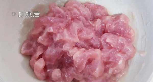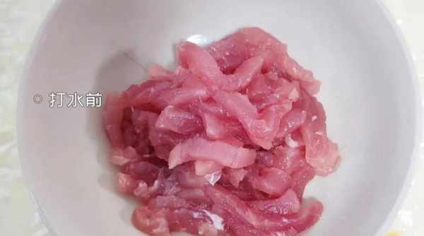 第二步:将里脊肉从片上切下来,将里脊肉切成片,用刀切成几根细丝,先用清水冲洗干净,检查水分。